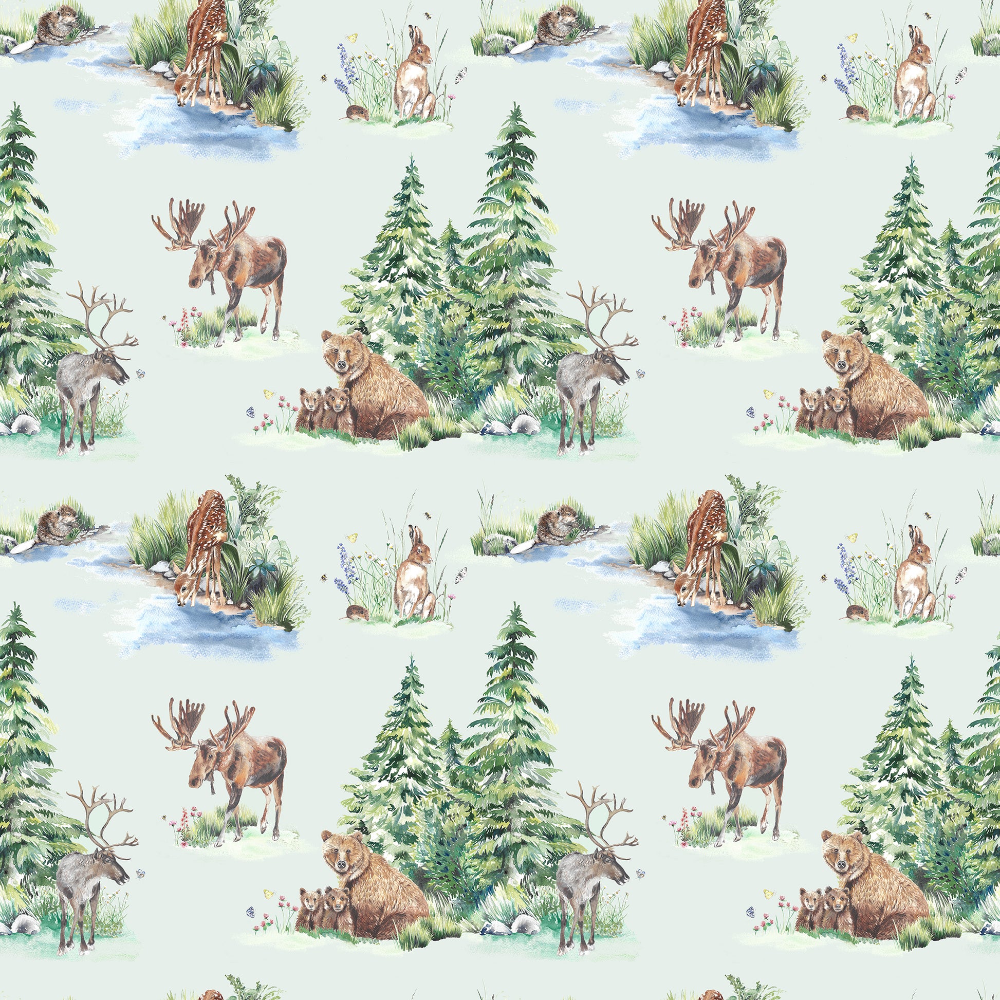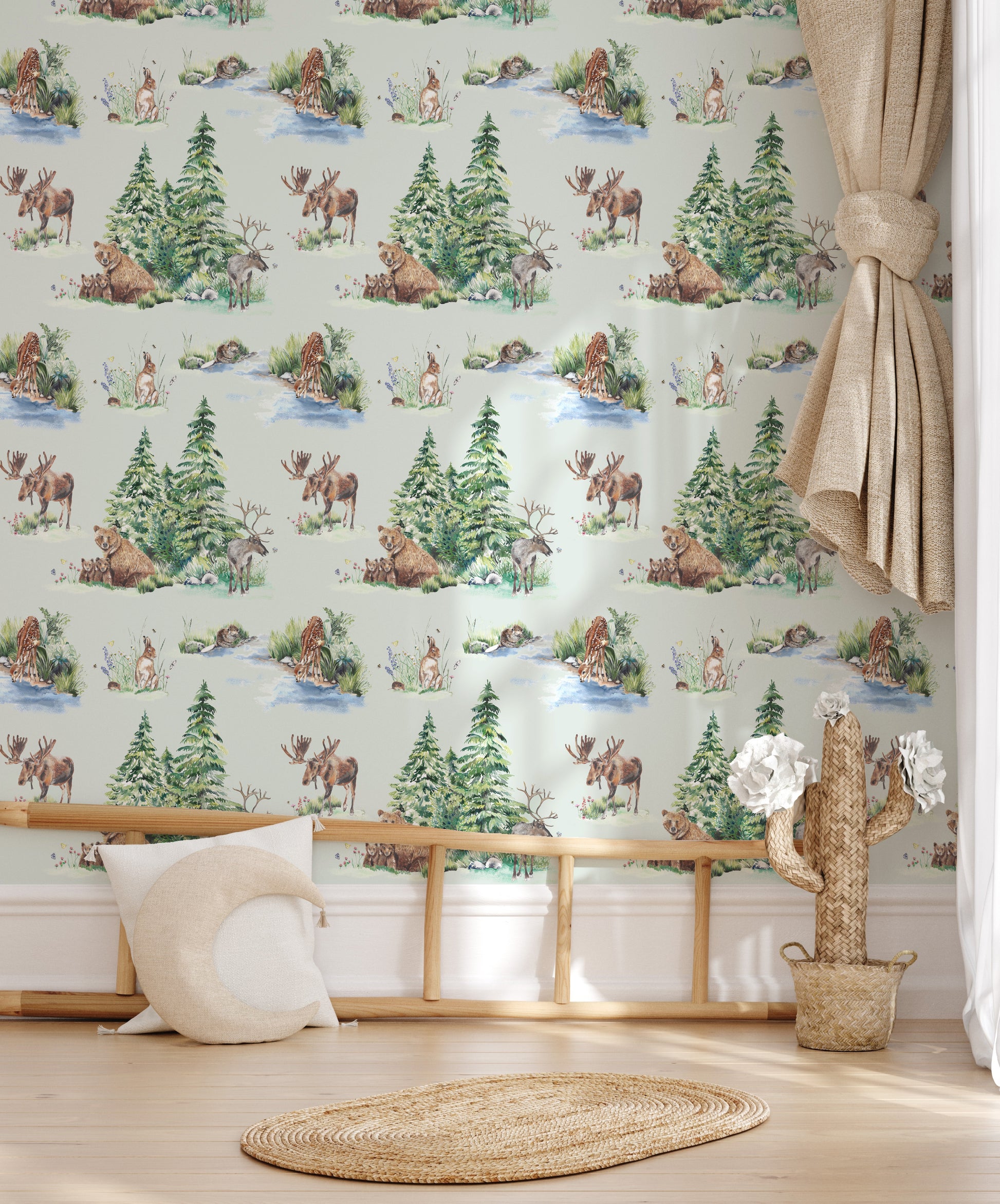 Bring the calm charm of the wilderness into your space with this watercolour alpine meadow wallpaper. Softly painted forest scenes repeat across the design, featuring gentle woodland animals nestled among evergreen trees, wildflowers, and quiet streams. The hand-painted style and muted, nature-inspired palette create a serene, storybook feel that’s both timeless and soothing.