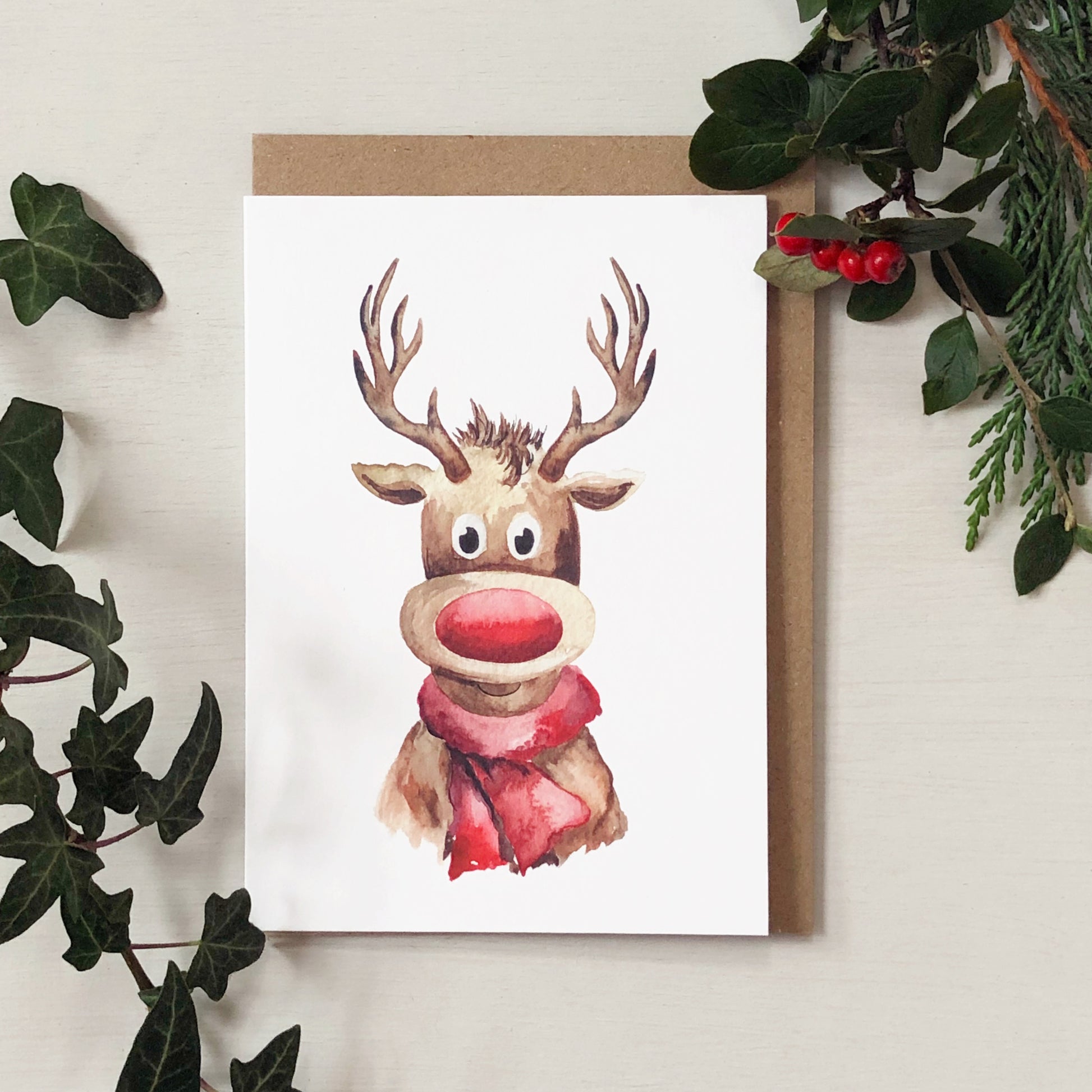 Spread festive cheer with this delightful red-nosed reindeer Christmas card, featuring original hand-painted watercolour artwork. Perfect for sending warm wishes to family and friends during the holiday season.