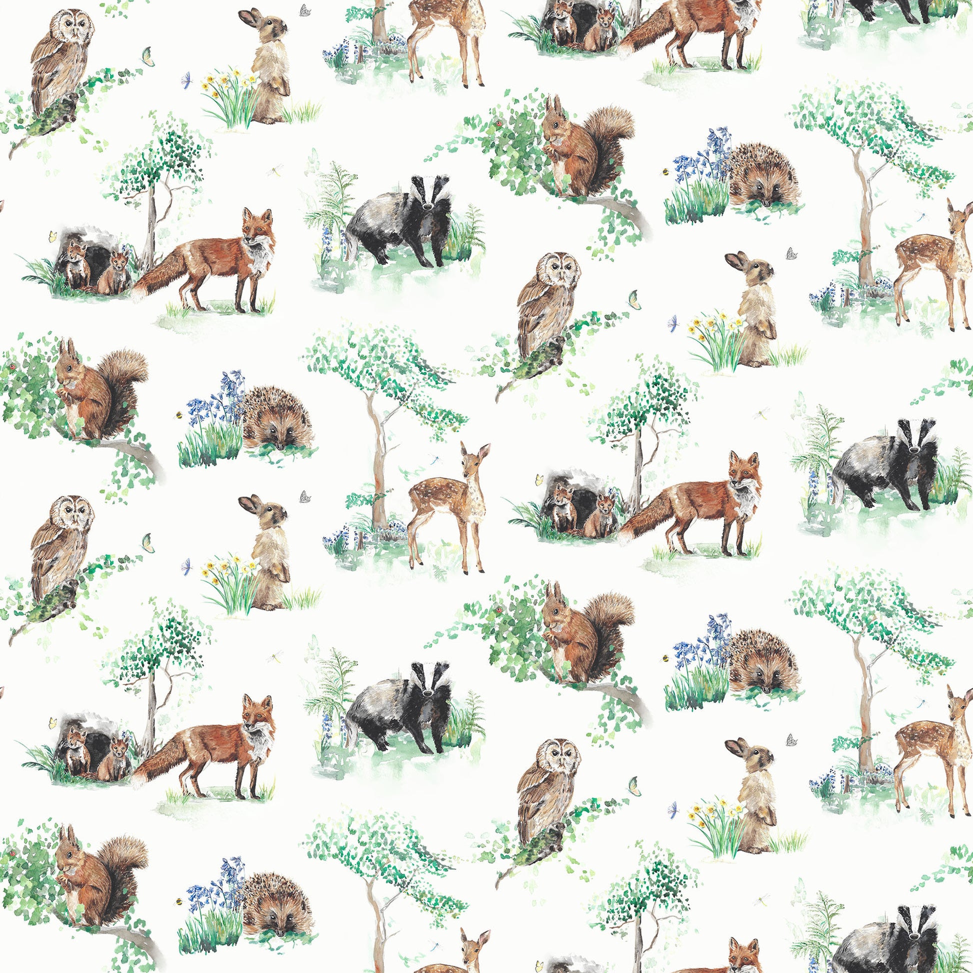 Inspired by the wildlife you might spot in the British woodlands and countryside, this gentle wallpaper is a beautiful decoration for a nursery or child's room. The natural colour palette of this timeless design will create an oasis of calm. Packed with delicately painted details and an abundance of animals to discover, this design is sure to inspire and delight budding nature lovers.